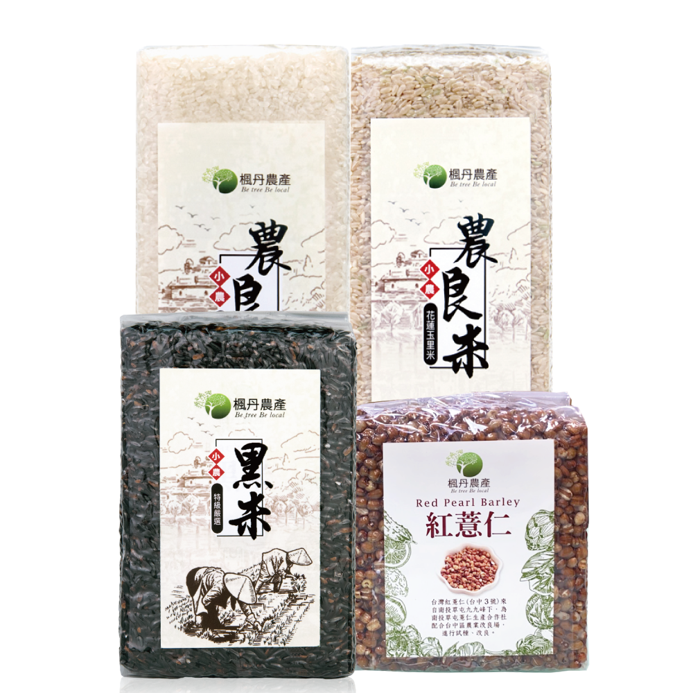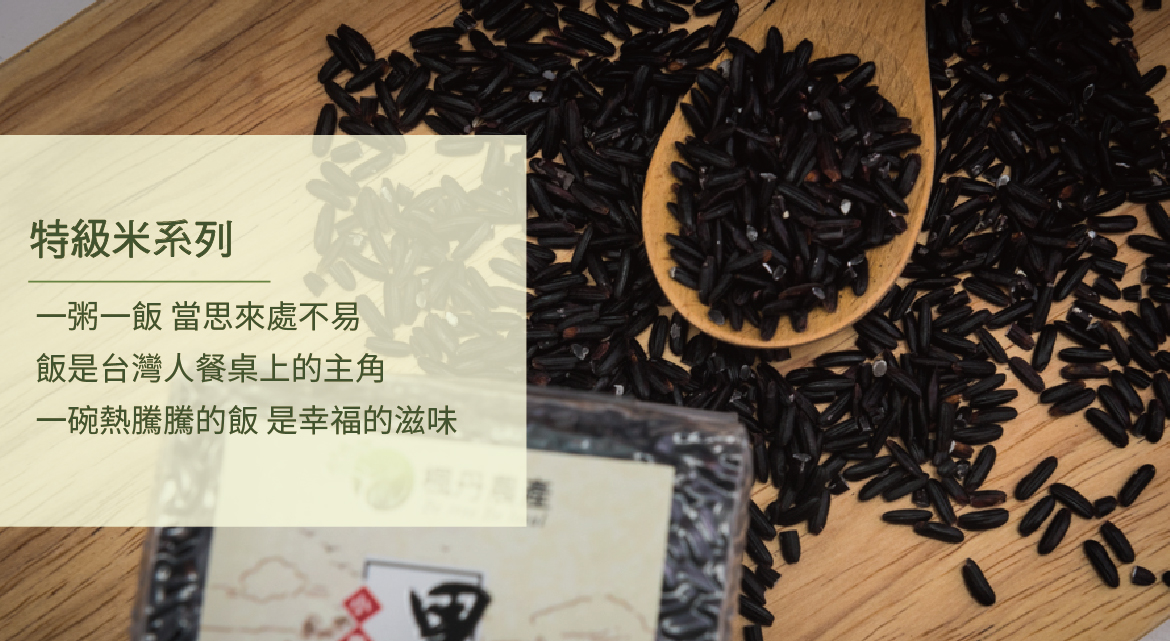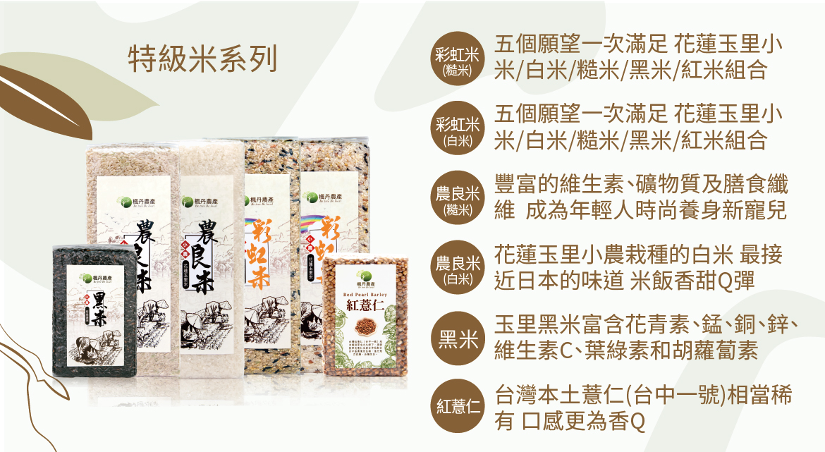 特級米系列: 農良米(糙米)、農良米(白米)、黑米、紅薏仁