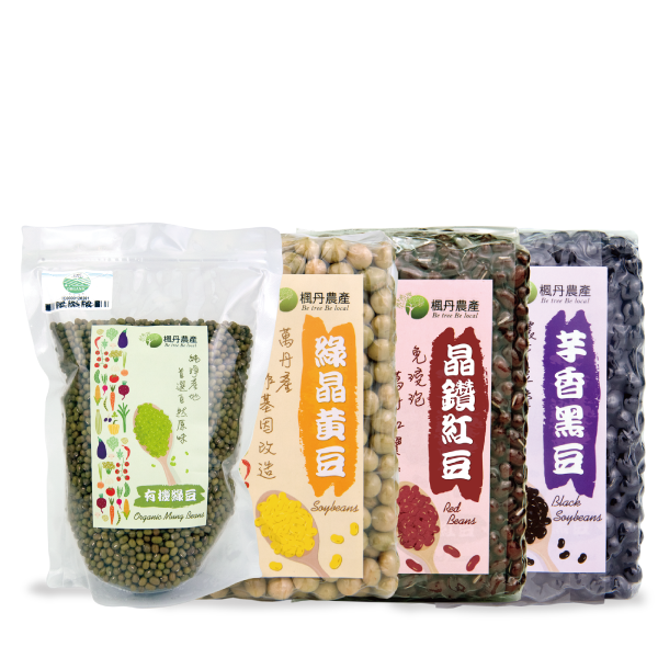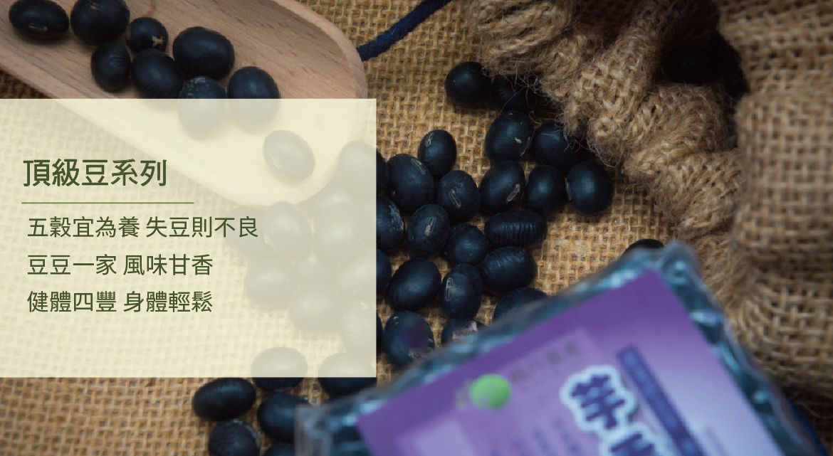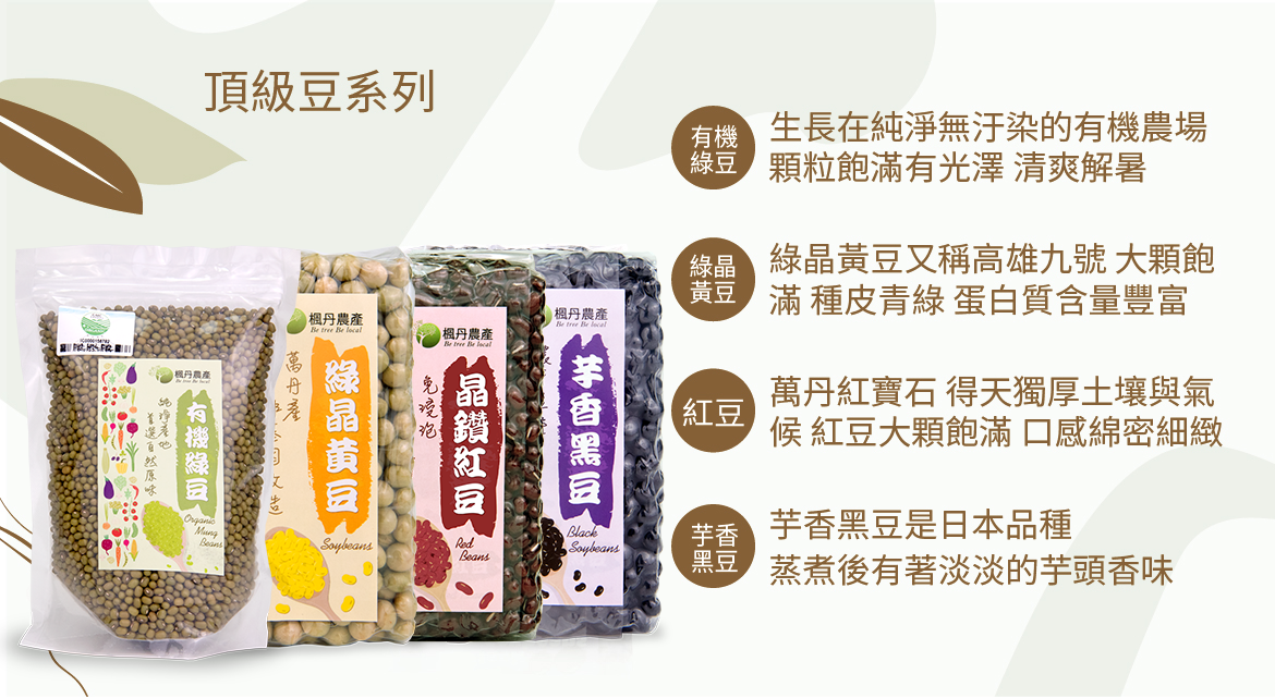 頂級豆系列: 有機綠豆、綠晶黃豆、晶鑽紅豆、芋香黑豆