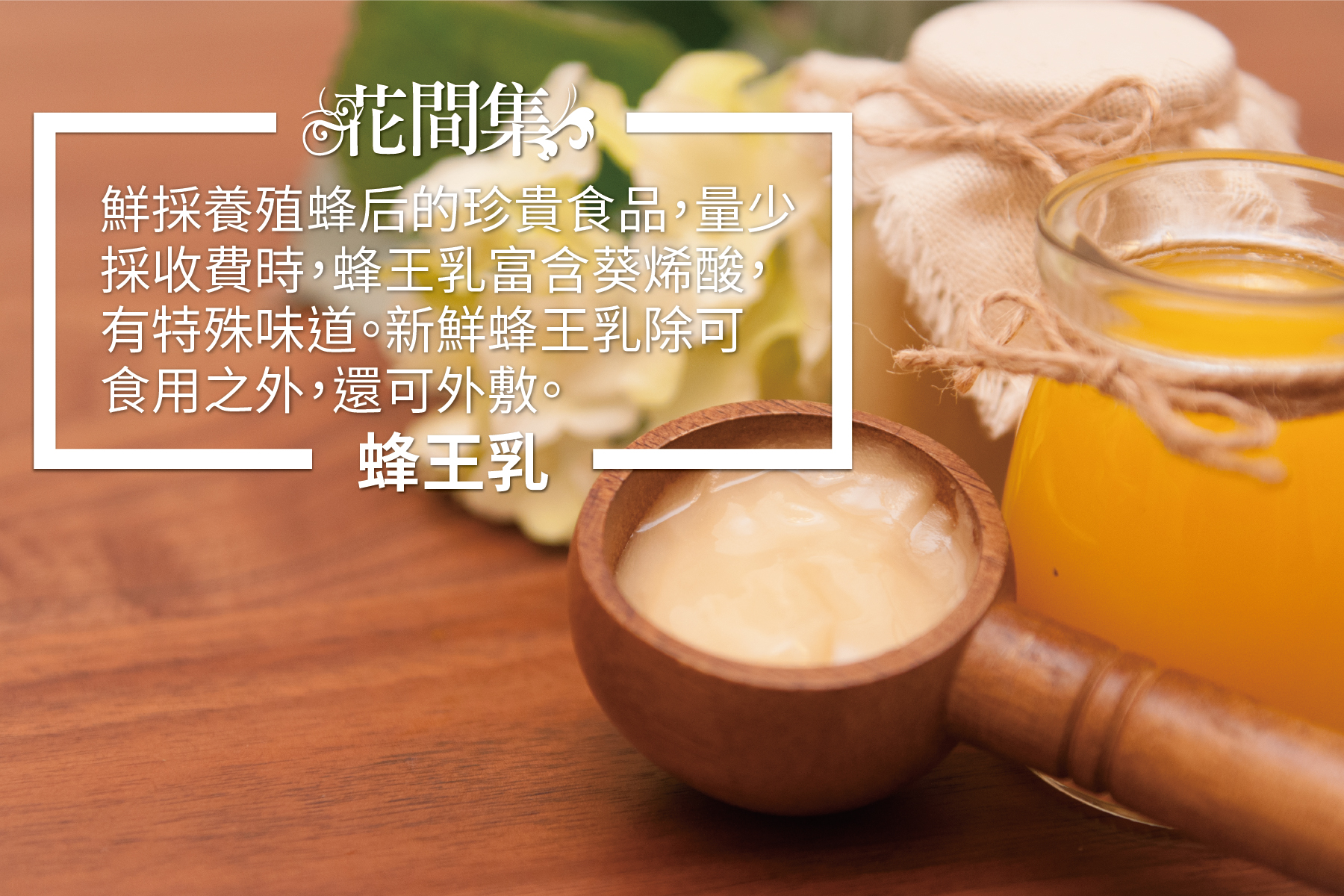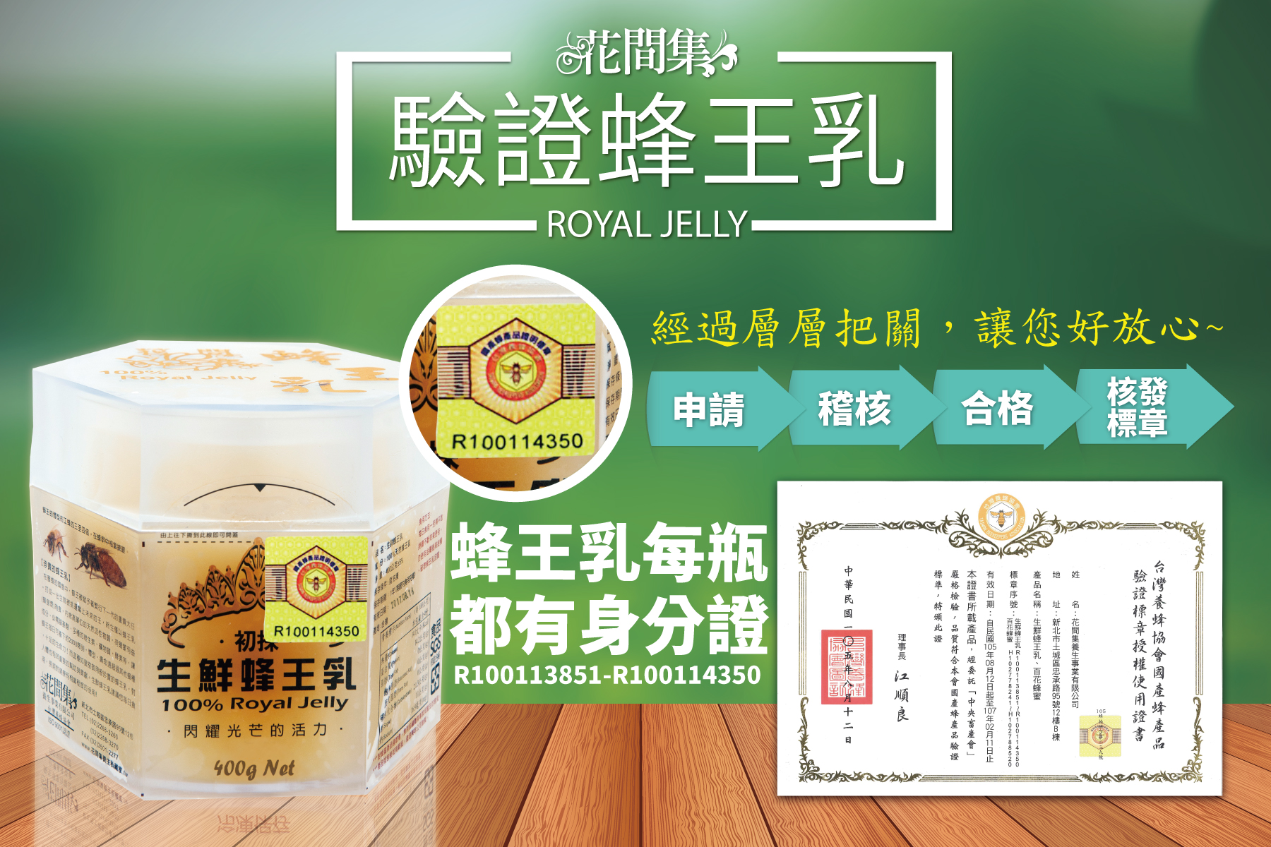 ROYAL JELLY [嚴選蜂王乳] 每瓶驗證蜜都具有身分證,經過層層把關,讓您吃個好放心~ 生產地 台灣 [生鮮蜂王乳] 鮮採養殖蜂后的珍貴食品,量少採收費時,蜂王乳富含葵烯酸,有特殊味道。新鮮蜂王乳除了可食用之外,還可外敷。 [蜂王乳精萃膠囊] 生鮮蜂王乳因為味道特殊,讓很多人不敢嘗試。膠囊易於攜帶保存,而且不會有特殊味道。 ***所有商品均投保3000萬產品責任險,確保消費者權益***
